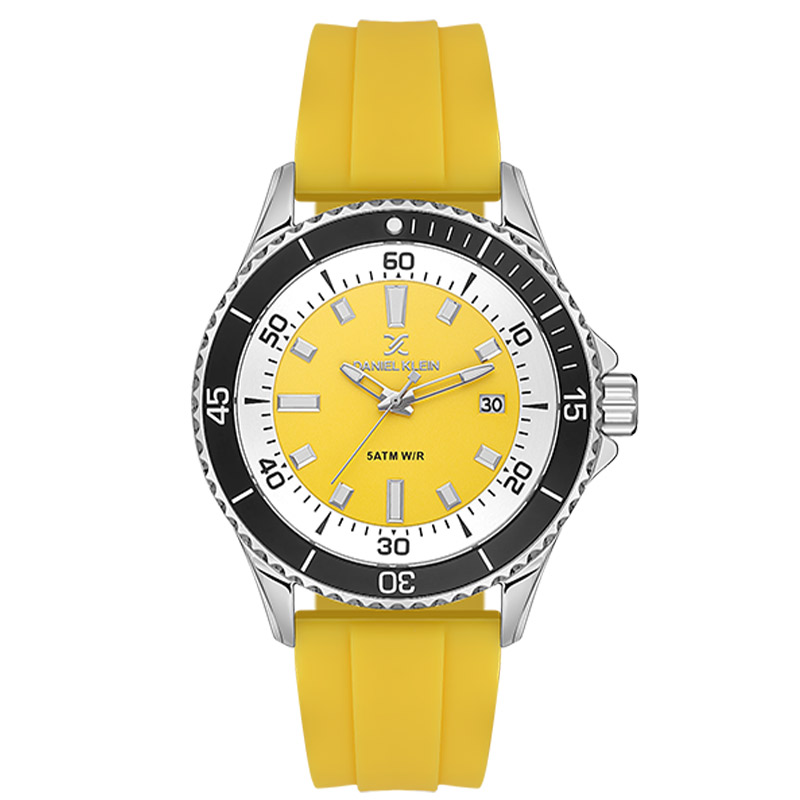 ساعت مردانه دنیل کلین زرد Daniel Klein DK.1.13683-3 یک ساعت مچی اسپرت با بند زرد روشن است. صفحه ساعت نیز زرد رنگ میباشد و اعداد و عقربههای ساعت به رنگ سفید و مشکی هستند که به وضوح قابل مشاهده هستند. دور قاب ساعت زه مشکی رنگ قرار دارد. قاب ساعت فلزی و براق است و عقربههای ساعت به رنگ نقرهای و مشکی هستند. بند ساعت از جنس رابر و به رنگ زرد است که با صفحه ساعت همخوانی دارد. این مدل دنیل کلین ضد آب تا عمق 50 متر میباشد.