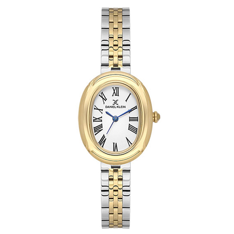 یک ساعت شیک و ظریف با قاب بیضی، بند استیل دو رنگ و موتور کوارتز دقیق؛ مناسب برای استفاده روزمره و استایلهای کلاسیک زنانه.
