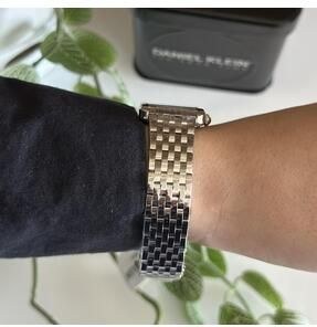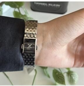 این ساعت با قاب مربعی باریک و صفحه سفید با اعداد رومی طراحی شده و حس یک استایل فرانسویِ کلاسیک و شیک را میدهد. بند استیل نقرهای آن ظاهر ساعت را برازنده، رسمی و همیشهمُد کرده است. عقربههای تیره و ظریف هم جذابیت لوکستری به آن میدهند.