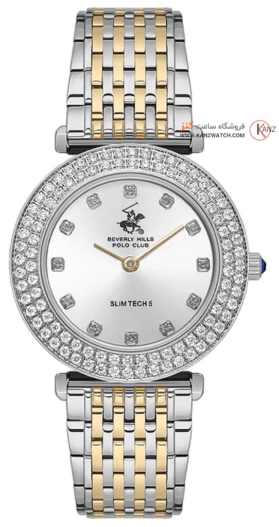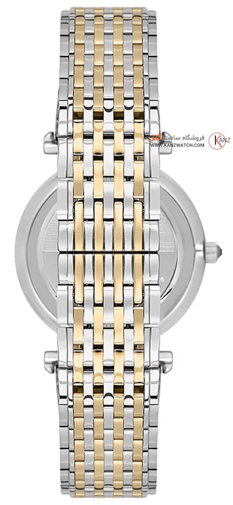 • بدنه و بند آن از فولاد ضد زنگ (استیل) ساخته شده و طراحی آن دو رنگ (مثلاً نقرهای + طلایی/دو رنگ) دارد — این یعنی دوام خوبی دارد و استایلش هم لوکس و شیک است.
