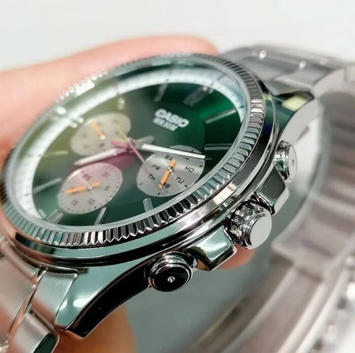 طراحی MTP-1375D-3AVDF کاملاً کلاسیک است اما رنگ صفحه آن باعث میشود از مدلهای معمولی متمایز شود. صفحه ساعت به رنگ سبز تیره طراحی شده که جلوهای عمیق، شیک و بسیار خاص دارد. این رنگ در نورهای مختلف، تغییر تُن ملایمی دارد و همین موضوع باعث میشود ساعت همیشه جذاب به نظر برسد.