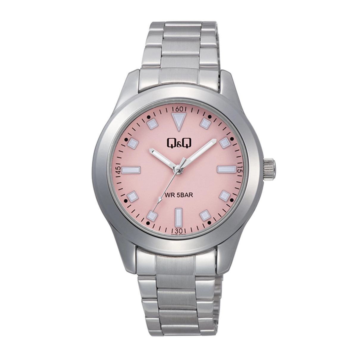 Q&Q Q35B‑006PY یک ساعت مچی زنانه آنالوگ با بند استیل ضدزنگ از برند Q&Q (ژاپنی زیرمجموعه Citizen) با طراحی ساده، شیک و همهکاره است.